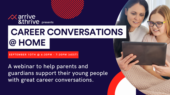 Arrive & Thrive is running a public webinar on September 10th at 6:30 pm (AEST) to support parents around Australia in having more positive career conversations at home. The webinar will share insights for parents to better support their young people in career decisions. Participants will receive a Career Conversation Kit.