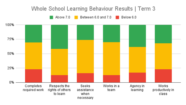 This week students in Year 9 and Year 10 have engaged with their Learning Behaviour reports in their Education for Life (E4L) classes. School-wide we have seen an average attendance of 90.89% at the end of Week 5, and an average Learning Behaviour of 6.63.  This active reflection in E4L encourages our students to be autonomous agents for their learning as they embed their own data into their My Learning Growth templates for all subjects. Students then set an attendance goal, an academic goal and an engagement goal, ensuring they refer to all aspects of their schooling that enable success. We also encourage our students to reflect on the subjects that may need additional attention, such as Tutor Group attendance in the mornings supported by a sleep routine at home, or a specific Learning Behaviour in one of their subjects that is impacting their overall average.
