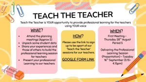 Come along and share your insights. After completing the Student Attitudes to School Survey last term, we want to students to come along and help to share insights and ideas with your teachers. This is your opportunity to provide feedback and practical ideas to help shape your classrooms.