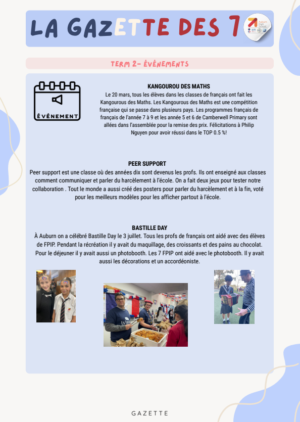 Year 7 French Partial Immersion Program Term 3 ‘La Gazette’